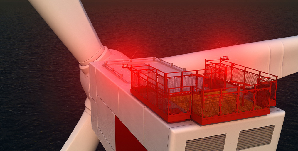 Mounted on the nacelle of offshore wind turbines, our medium intensity obstruction lights are typically red flashing lights that alert pilots to the presence of an obstruction. To ensure 360-degree visibility, two lights are installed on top of each nacelle, offering full coverage in all directions.
